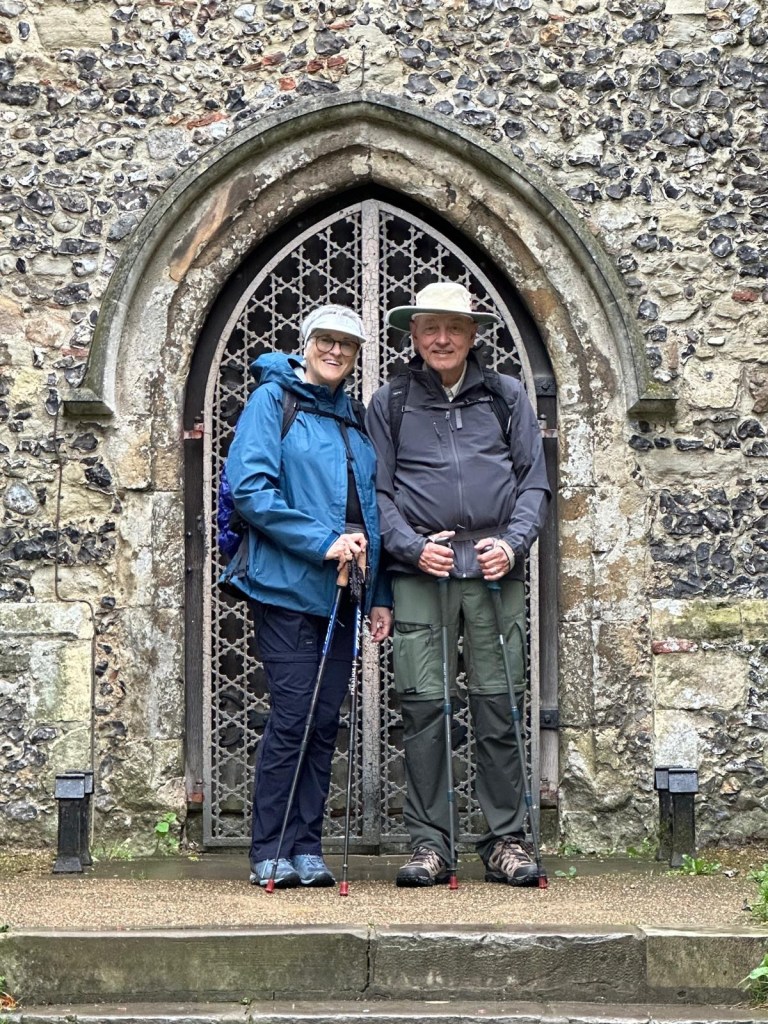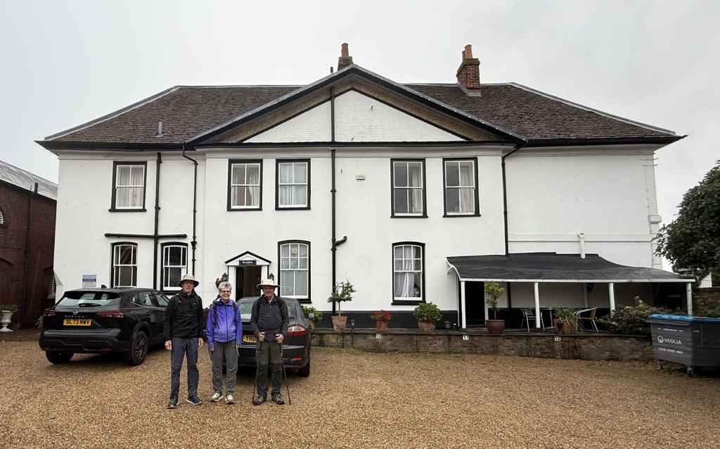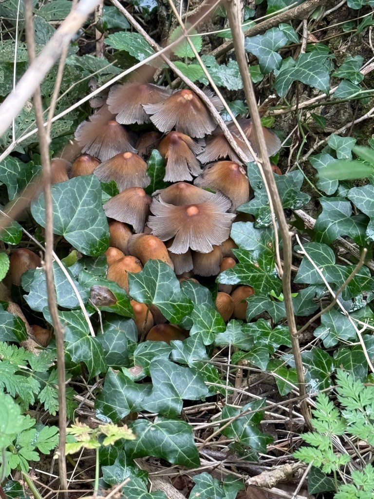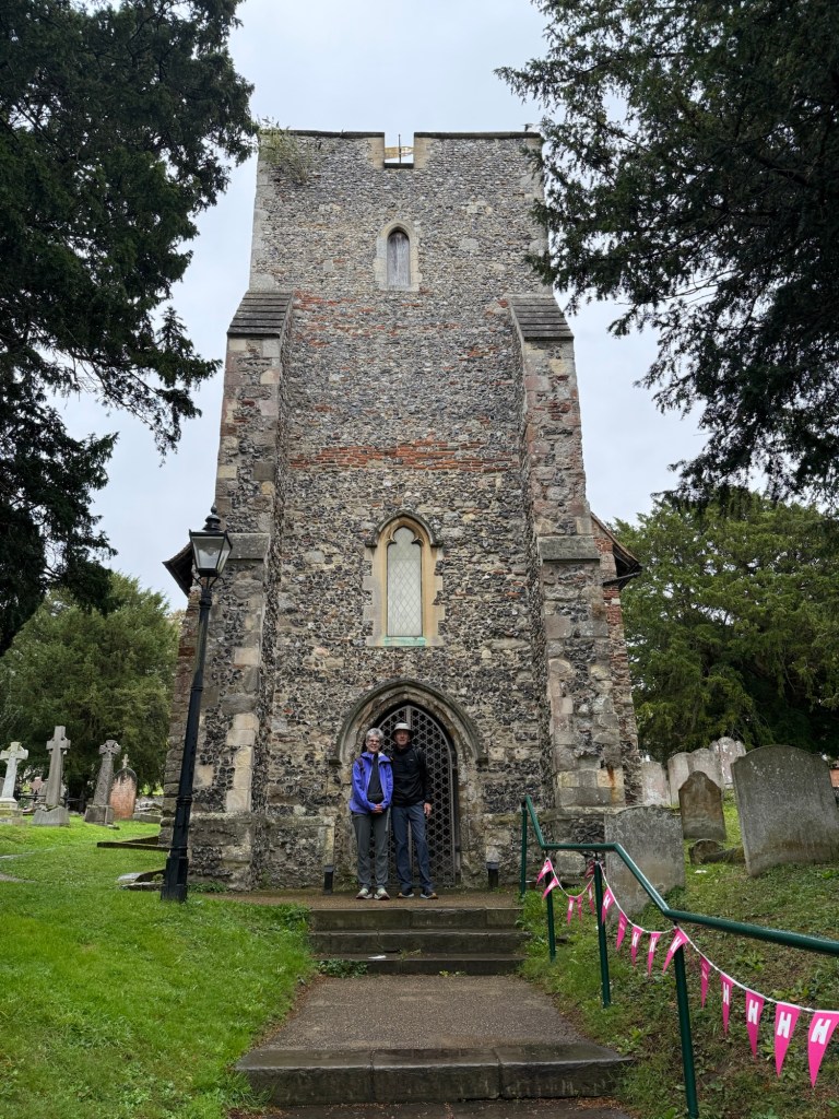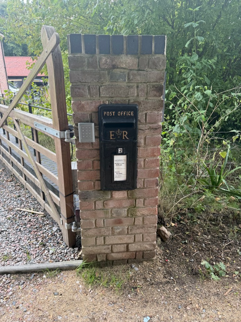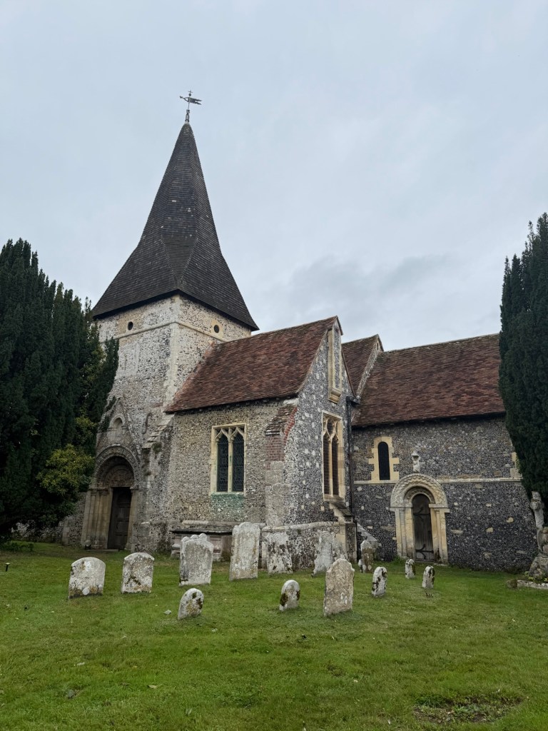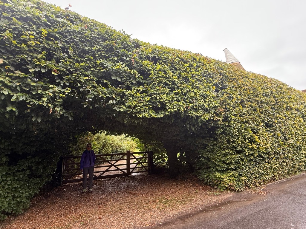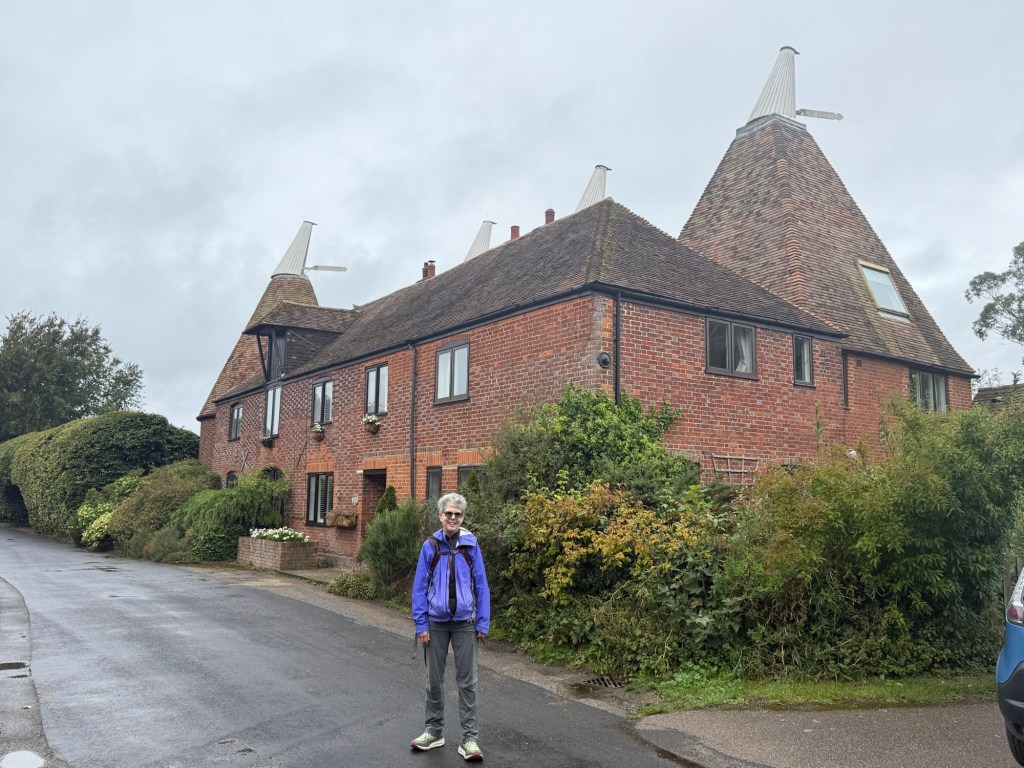 A sign in the yard of St Martin’s Outside St Martin’s Canterbury Cathedral in the background En routeA converted oast house. An oast house is an agricultural building with a distinctive conical roof, used historically to dry hops as part of the brewing process for beer. These iconic structures feature a kiln with a rotating cowl to create a draft, a drying floor above, and a stowage or barn area for cooling, pressing, and storing the dried hops.While many have fallen out of use due to the decline of domestic hop-growing, numerous oast houses are now converted into private residences, shops, and other businesses (thanks Google)Another converted oast house…… with decorative catsSt Mary’s Church in PatrixbourneThick roof thatchingMorning tea (muesli bars)A post box set in a residential gatepostGlistening Inkcap mushroomsHedgerows everywhere, many with Hawthorn and Sloe berries