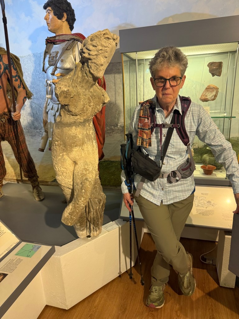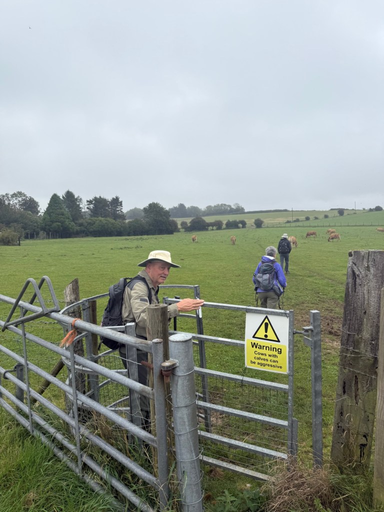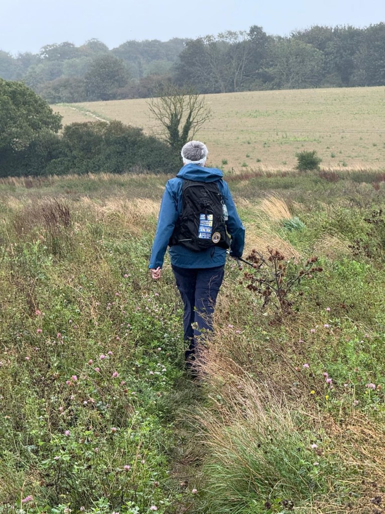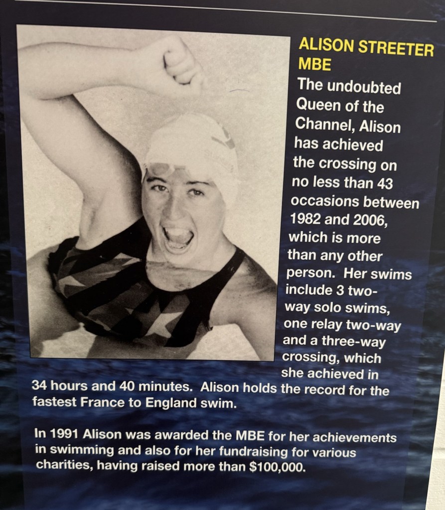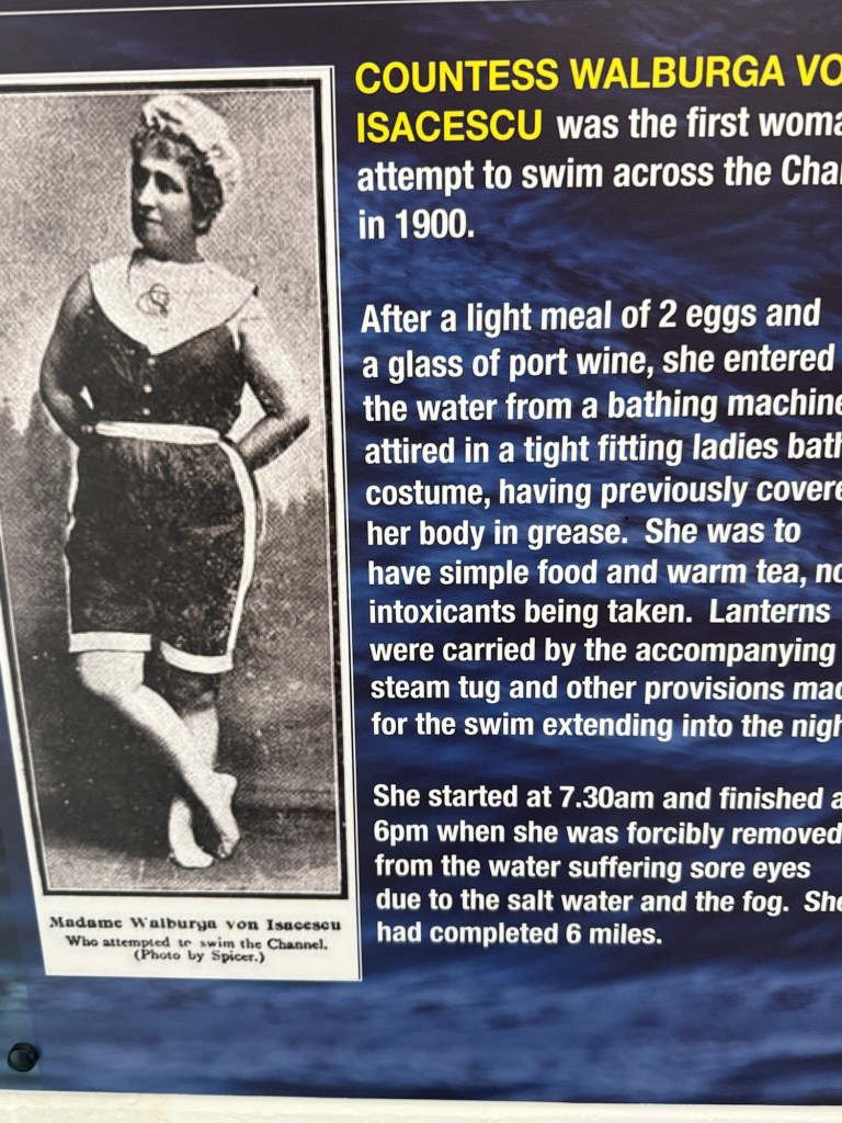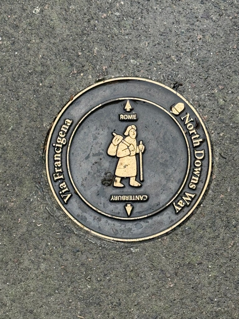 At St Andrew’s Church, ShepherdswellFlint embedded in the walls. We’ve seen this on a number of old buildings Another Via info signYou’ve got to love a place that leaves fresh water and dog biscuits out, and is open, and has a stamp for our credentials!Some interesting and varied terrain todayMonumenta Romana: This artwork is a contemporary folly that takes the form of a cupola, designed to complement the nearby Belvedere at Waldershare Park (thanks Google)Nora and Ralph, wire haired Hungarian Vizslas with Jo, their human (off screen)Waldershare House, an historic country house that has now been turned into apartments Bill, a Patterdale Terrier, with his human, MartinPiddle Wood, as identified in the above sign All Saints, Waldershare… open and with another stamp 👏🏼👏🏼👏🏼This is the closest thing we’ve seen to any wildlife! (Except a squirrel that ran past us later in the day)The sign reads “Burrows in this fallen tree are homes to Rabbits a fox and insects”This enormous yew tree is said to be over 1000 years old We were directed through this paddock and not to take the private trackWith the cattleAnd a skittish calf or twoLovely thatched roof and cool vintage MG at this place Hedgerow gap between paddocksWindy!The Via Francigena from Canterbury to Dover follows the same route as part of the North Downs Way which runs from Farnham to Dover (246km/153 miles)Houston, we have a problem!!!A friendly bullA Shaggy Inkcap, also commonly referred to as Lawyer’s Wig or Shaggy Mane (thanks Google)A Birch Polypore fungus, also known as Fomitopsis betulina or birch bracket (thanks Google)Good foraging today… lots of ripe blackberries as well as apples Into Dover and these waymarkers appeared embedded in the pavementsThe blue sign reads: GERTRUDE TOLAND MD. FRCS 1901-1985 LIVED AND PRACTISED AT CLYDE HOUSE SURGEON AT BUCKLAND HOSPITAL SAVED MANY LIVES FROM DUNKIRK EVACUATION & BATTLE OF BRITAINDover Castle at the end of Castle Street At St Mary’s Church with James who very helpfully retrieved the stamp for our credentialsAt the Elephant & Hind Bar with Sam. A delicious meal prepared by Matthew… great fish & chips and fabulous service & advice from Sam .Into the museum next door… Lynn reckons this is an early female pilgrim… there’s still not many loos along the way!The Channel Swimming Association’s trophy cabinet. Some highlights from the information boards: YOUNGEST SWIMMER TO CROSS THE CHANNEL: 1988 Thomas Gregory aged 11 years, 336 days. Since 1994 the rules forbid solo attempts by swimmers under the age of 16. OLDEST PERSON TO SWIM ACROSS THE CHANNEL: 2014 Otto Thaning at 73 years 177 days.Sorry about the bad photography!An Aussie! This Bronze Age boat was discovered in Dover in 1992 and dates from 1550BC It measures 9.5 x 2.4 metres (31 x 8 ft) and is made from four oak planks held together with oak wedges and yew stitches. The seams and stitch holes are packed with moss and beeswax. The boat is as discovered with no added or replica pieces. Buildings on Dover’s foreshore promenadeViews of the famous white cliffsWalking back through town through an installation… as if there wasn’t enough mizzle today!On the bus (top deck, front row) heading home to CanterburyDinner in the hotel lounge… sandwiches, fruit, yoghurt, trail mix, chocolate mousse… it was a feast!