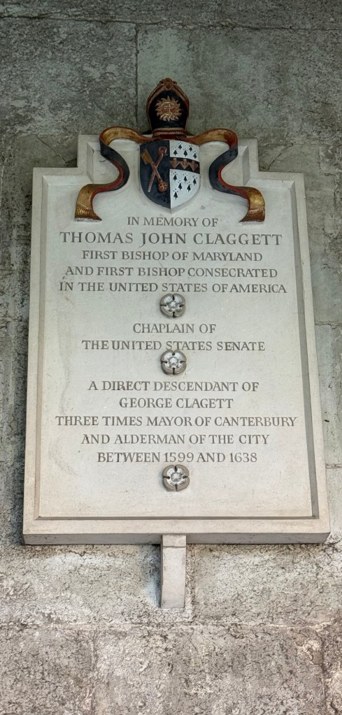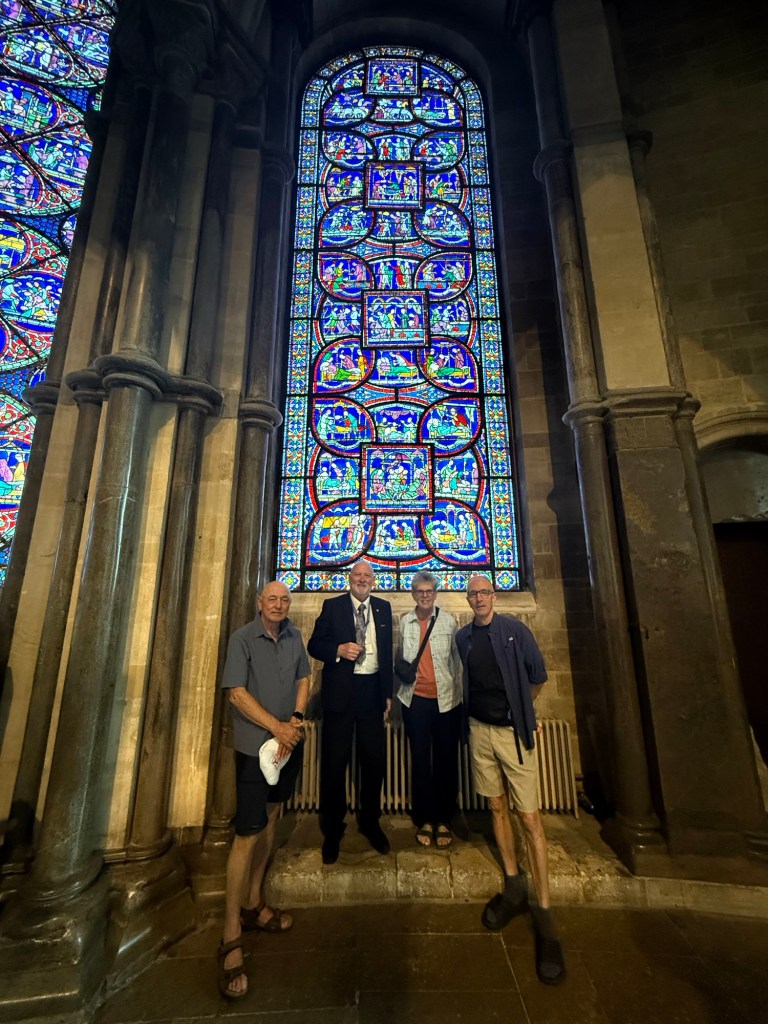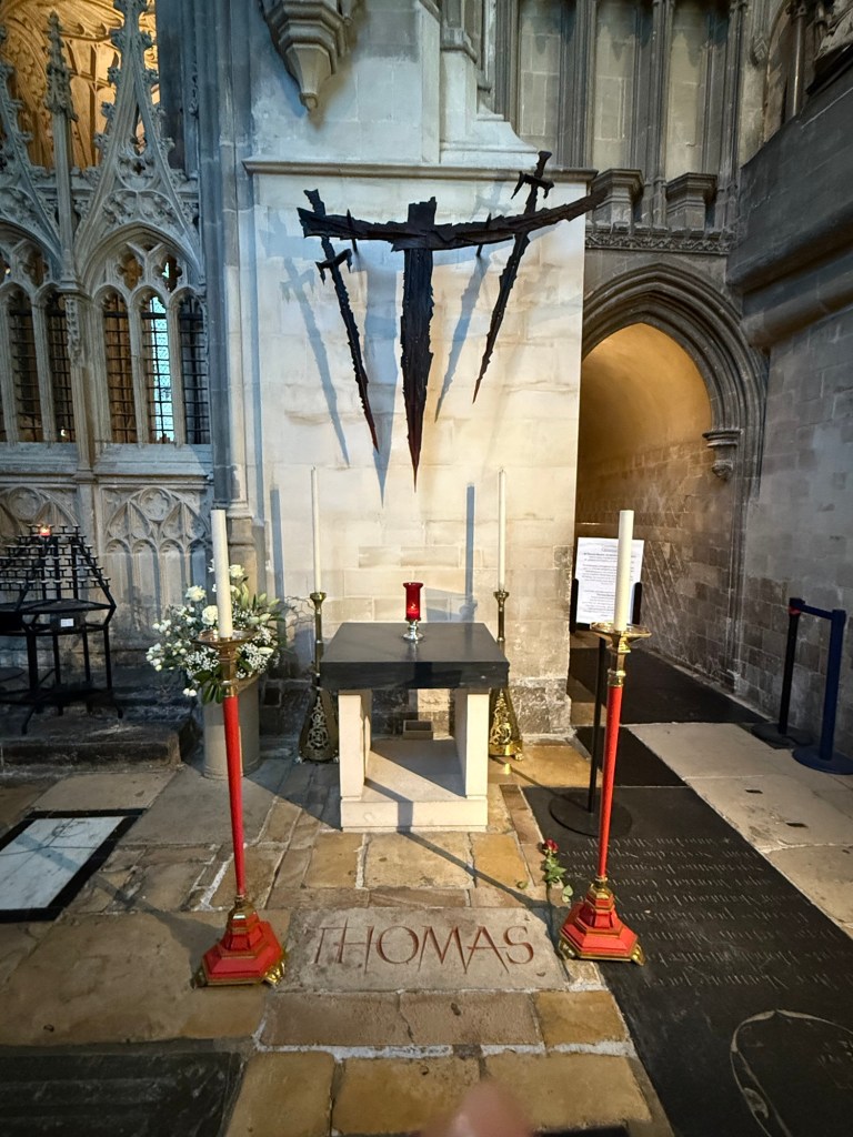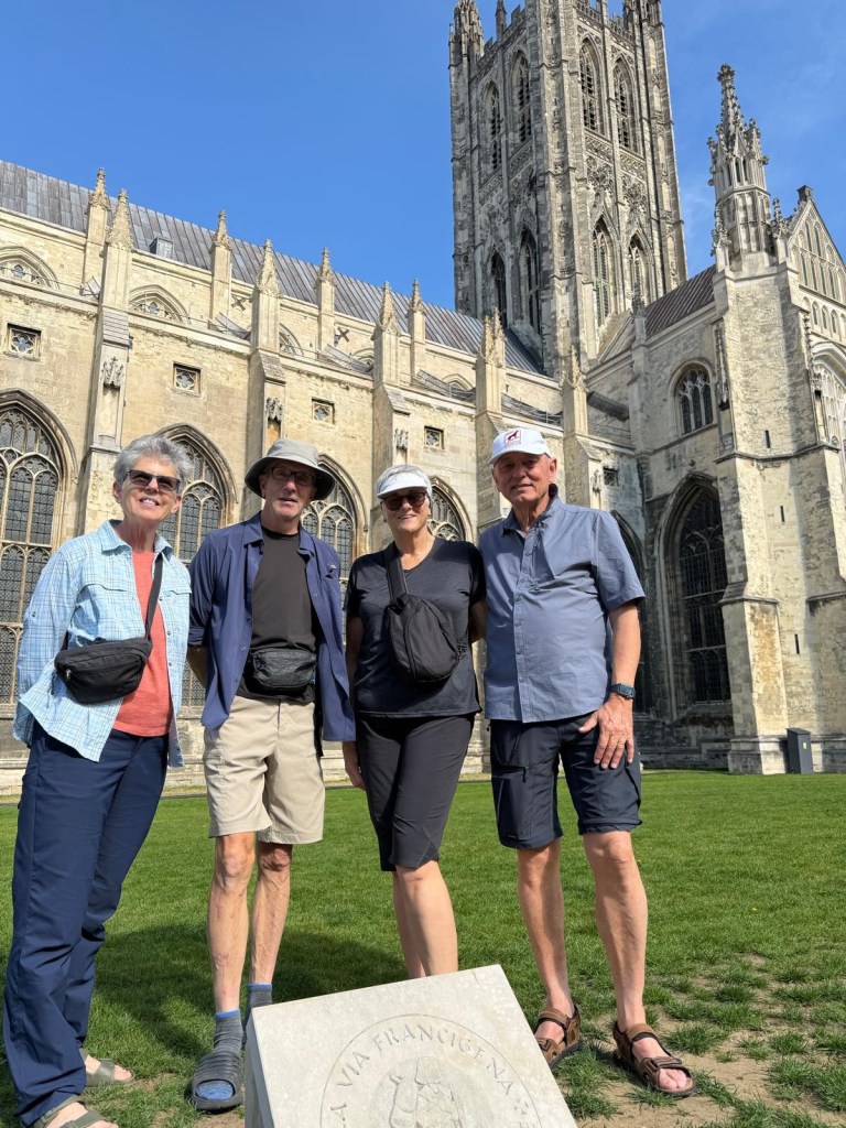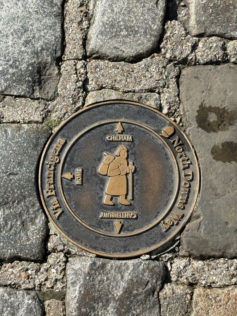 Typical, all on our phones With the very helpful CherylAnother waymarker near the Cathedral… note the arrows have moved to reflect the directionsCanterbury CathedralIn the Nave looking eastLooking up Looking westAn interesting clock in the Chapel of St AndrewThe pilgrims’ stairsThe Martyrdom, the site where Archbishop Thomas Becket (the ‘meddlesome priest’) was murdered in December 1170 by four knights of King Henry II thereafter making Canterbury one of the most important pilgrimage sites in Europe.Through the fabulous door leading to the Great CloisterChapter HouseView from the Great CloisterTomb of Sir George Gipps, Governor of New South Wales & ‘its dependencies’ (Australia) 1838-1846One of very few references to the USA lunch of yummy baguettes/wraps sitting admiring the Cathedral. Then there was an attack! A HUGE seagull swooped and stole Hans’ baguette from his hands! Like Flash Gordon Hans was up and dashed after the gull to retrieve his lunch. Although successful, it was irretrievably damaged. Fear not, he didn’t go without lunch.Gary returned from the loo with this photo of twinned Cathedral toilets from Rwanda & MalawiThe Canterbury War Horse. The info board states that … Over eight million horses died during the First World War, of which many travelled through Kent on their way to the continent. The Canterbury War Horse represents conflict and the loss of human and animal life without being over literal, and is presented with dignity, its head bowed in respect and solemnity in this place of quiet contemplation, reflection and remembrance.The Plane Tree, the info board states that: Canterbury is home to a striking variety of plane tree, which is easy to spot due to its impressively wide trunk. It is commonly known by the nickname of the ‘baobab’ plane, after its resemblance to the African trees of that name; which are noted for shedding strips of bark, and helping to fend off the effects of pollution.Really?Really???In the herb garden, relaxing on a bench given by the Robert Lee Blaffer Trust of Houston, TexasOutside the grounds, we passed the Crooked House. An internal chimney slipping gave the house its wonky appearance, but a steel frame now keeps it in place. Writing on the eaves states “a very old house bulging over the road… leaning forward, trying to see who was passing on the narrow pavement below..” Charles Dickens, 1849.Gary noticed a poster about this “0 mile marker” for the Via so we headed back into the Cathedral to see it. The steward then contacted the Pilgrim Officer (Torin), who came out to greet us and share some pilgrim historyWith TorinThanks Torin In front of one of a number of stained glass windows that recount the stories recorded from early pilgrims. This is unusual in Cathedrals as they usually focus on biblical characters and saints, not commoner pilgrimsOne of the pilgrim storiesA pilgrim riding a horse … apparently to ‘canter’ is derived from CanterburyTorin took us behind a pillar and showed us this historical “graffiti” showing a pilgrim praying and God listening… I figure very few people would have seen this!Outside the Pilgrim TunnelThe list of Archbishops – Sigeric the Serious (highlighted) was the first person to make a record of his pilgrimage to Rome following the Via Francigena to get his vestments in 990.
