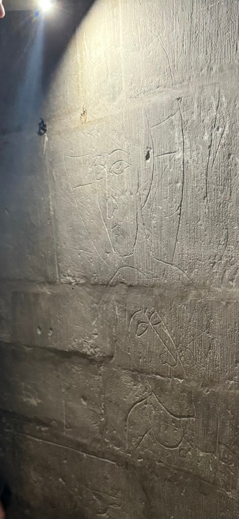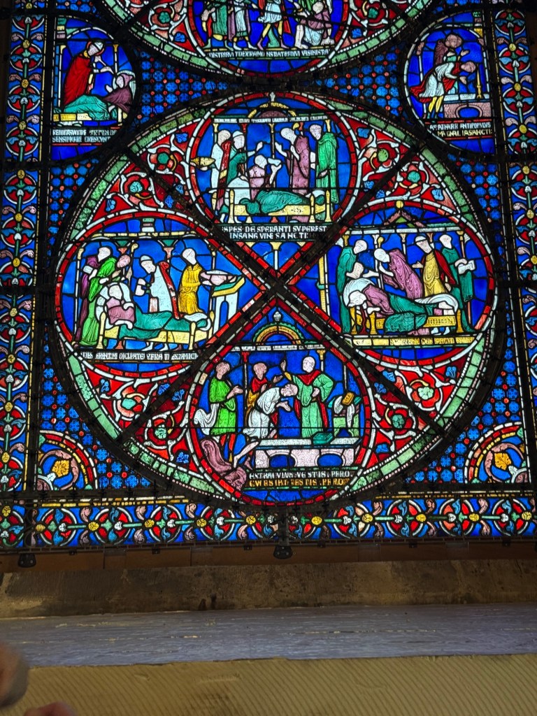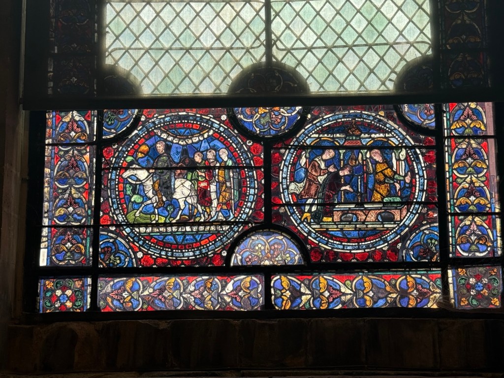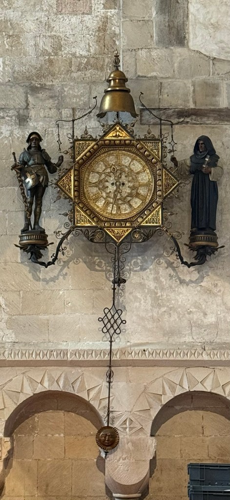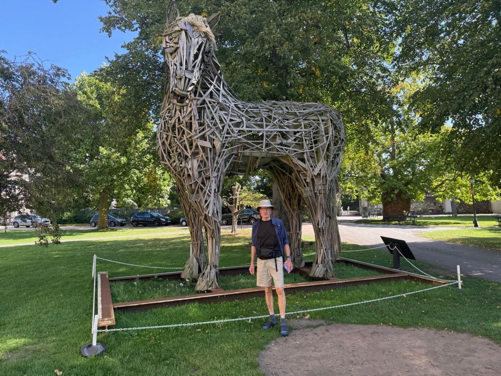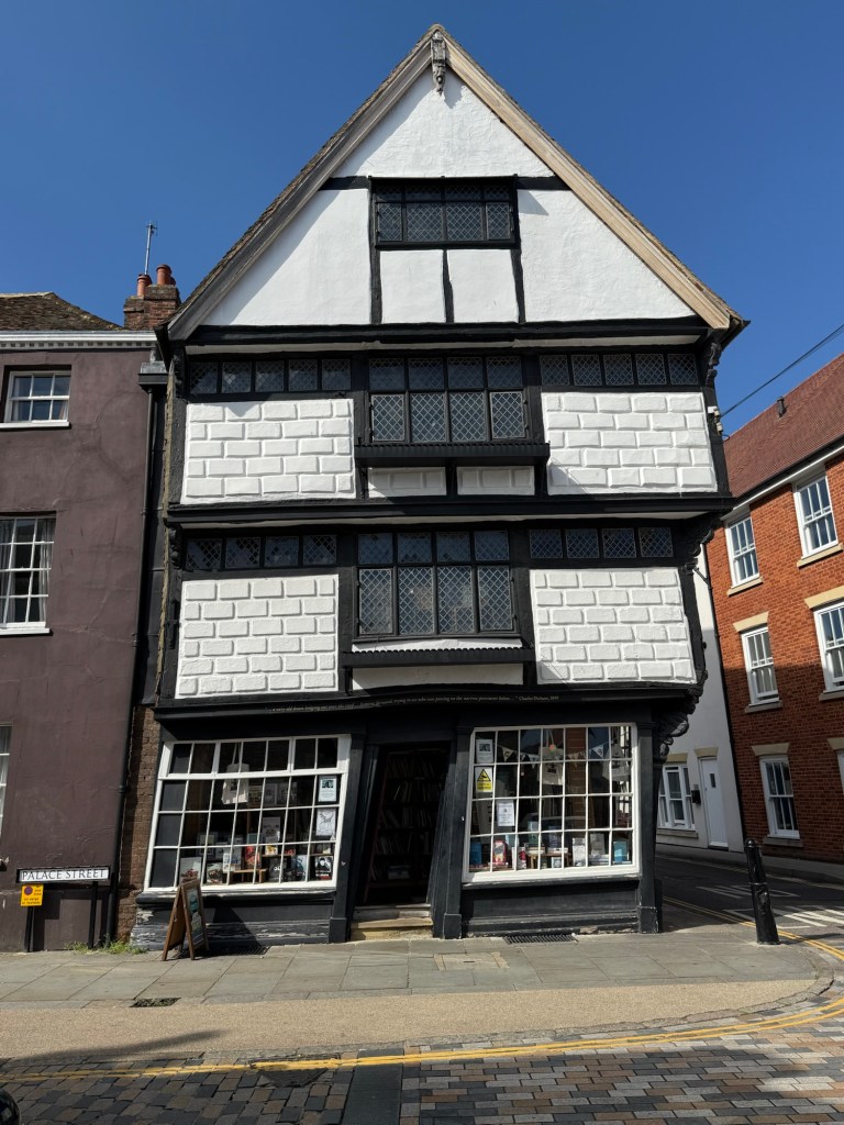 Typical, all on our phones With the very helpful CherylAnother waymarker near the Cathedral… note the arrows have moved to reflect the directionsCanterbury CathedralIn the Nave looking eastLooking up Looking westAn interesting clock in the Chapel of St AndrewThe pilgrims’ stairsThe Martyrdom, the site where Archbishop Thomas Becket (the ‘meddlesome priest’) was murdered in December 1170 by four knights of King Henry II thereafter making Canterbury one of the most important pilgrimage sites in Europe.Through the fabulous door leading to the Great CloisterChapter HouseView from the Great CloisterTomb of Sir George Gipps, Governor of New South Wales & ‘its dependencies’ (Australia) 1838-1846One of very few references to the USA lunch of yummy baguettes/wraps sitting admiring the Cathedral. Then there was an attack! A HUGE seagull swooped and stole Hans’ baguette from his hands! Like Flash Gordon Hans was up and dashed after the gull to retrieve his lunch. Although successful, it was irretrievably damaged. Fear not, he didn’t go without lunch.Gary returned from the loo with this photo of twinned Cathedral toilets from Rwanda & MalawiThe Canterbury War Horse. The info board states that … Over eight million horses died during the First World War, of which many travelled through Kent on their way to the continent. The Canterbury War Horse represents conflict and the loss of human and animal life without being over literal, and is presented with dignity, its head bowed in respect and solemnity in this place of quiet contemplation, reflection and remembrance.The Plane Tree, the info board states that: Canterbury is home to a striking variety of plane tree, which is easy to spot due to its impressively wide trunk. It is commonly known by the nickname of the ‘baobab’ plane, after its resemblance to the African trees of that name; which are noted for shedding strips of bark, and helping to fend off the effects of pollution.Really?Really???In the herb garden, relaxing on a bench given by the Robert Lee Blaffer Trust of Houston, TexasOutside the grounds, we passed the Crooked House. An internal chimney slipping gave the house its wonky appearance, but a steel frame now keeps it in place. Writing on the eaves states “a very old house bulging over the road… leaning forward, trying to see who was passing on the narrow pavement below..” Charles Dickens, 1849.Gary noticed a poster about this “0 mile marker” for the Via so we headed back into the Cathedral to see it. The steward then contacted the Pilgrim Officer (Torin), who came out to greet us and share some pilgrim historyWith TorinThanks Torin In front of one of a number of stained glass windows that recount the stories recorded from early pilgrims. This is unusual in Cathedrals as they usually focus on biblical characters and saints, not commoner pilgrimsOne of the pilgrim storiesA pilgrim riding a horse … apparently to ‘canter’ is derived from CanterburyTorin took us behind a pillar and showed us this historical “graffiti” showing a pilgrim praying and God listening… I figure very few people would have seen this!Outside the Pilgrim TunnelThe list of Archbishops – Sigeric the Serious (highlighted) was the first person to make a record of his pilgrimage to Rome following the Via Francigena to get his vestments in 990.