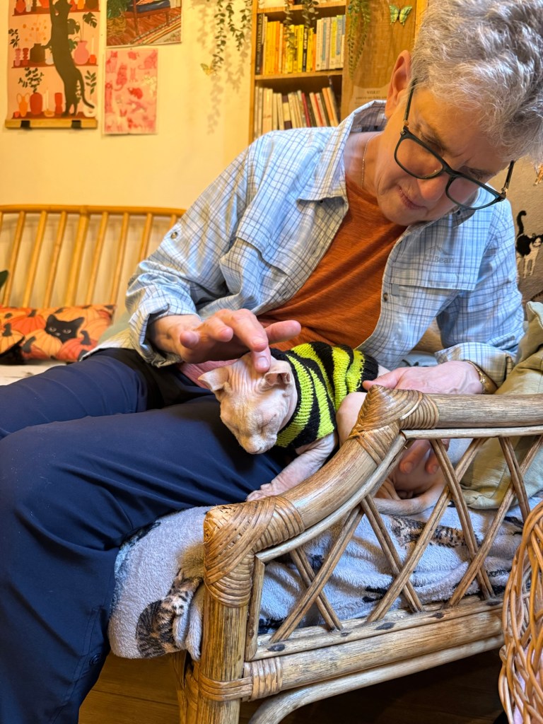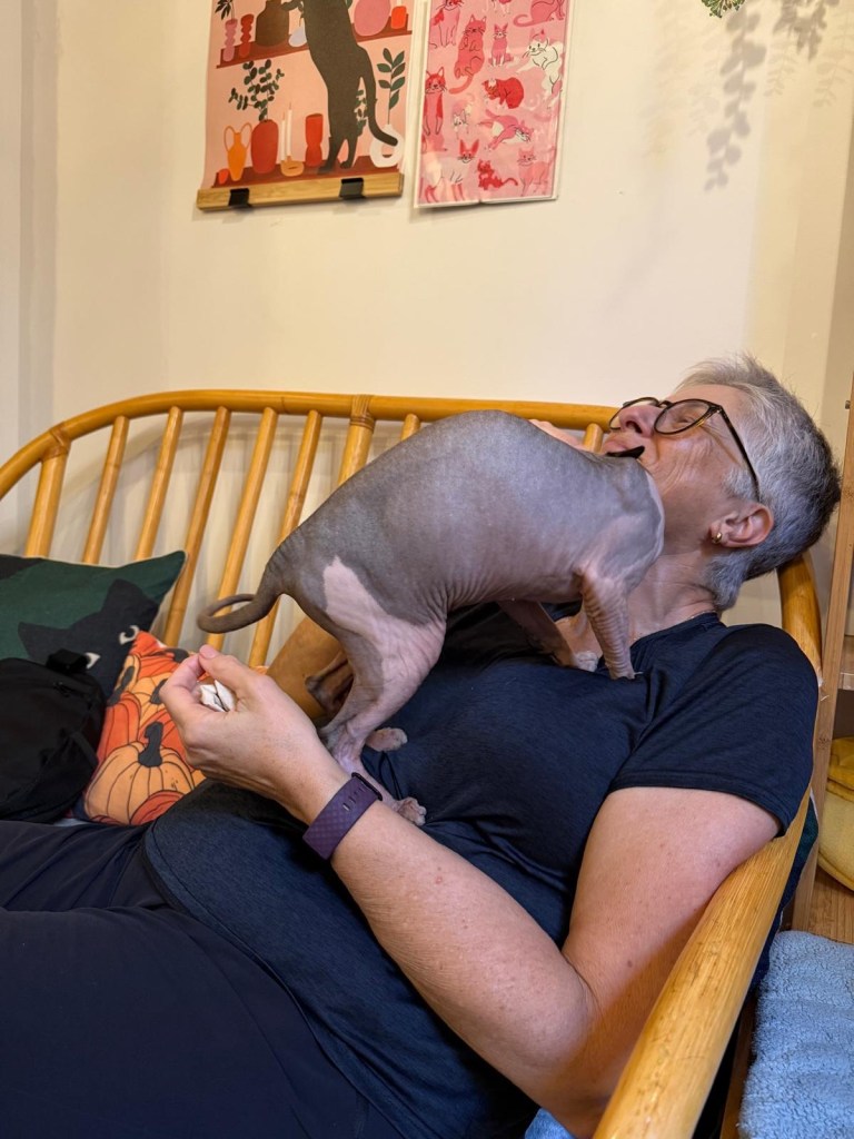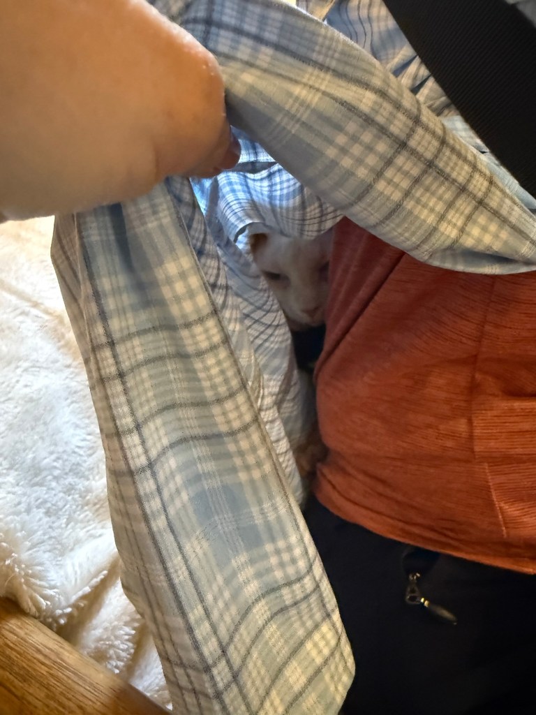 Getting acquainted with GaribaldiGetting a little too acquainted with Garibaldi as he burrowed inside Lynn’s shirtOur afternoon teaBinx and Clawdia (front)Up close and personal
