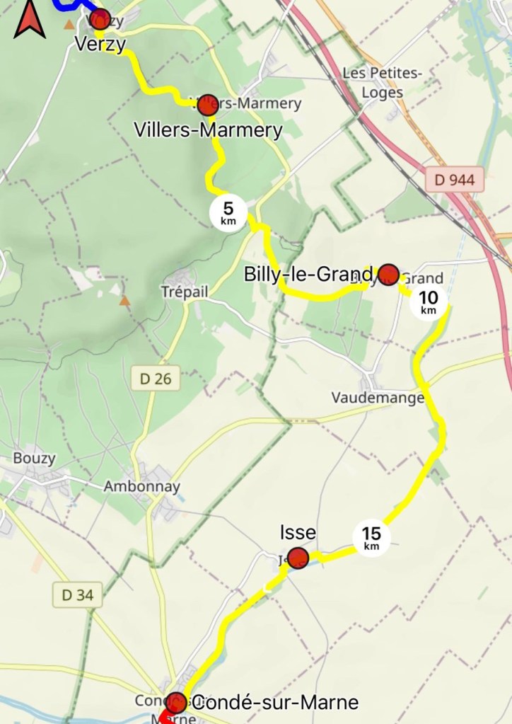 The penultimate leg of this hike! It was a moving day for us today, changing from Reims to Matougues (about 15km from Châlons en Champagne). Consequently we walked the route backwards to minimise car shuffling. Most of the first half was along the Canal de l’Aisne à la Marne, then up through the fields and forests to the vineyards of Verzy again.