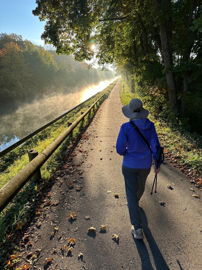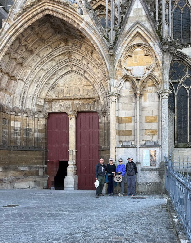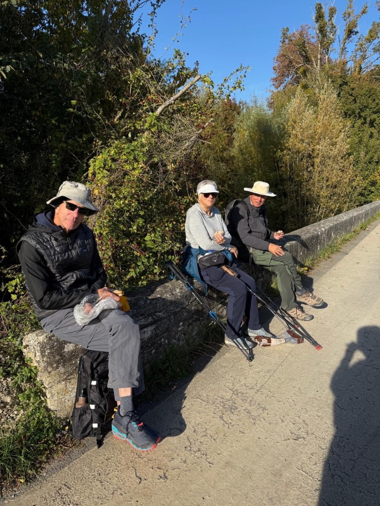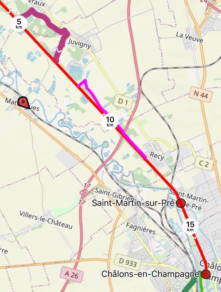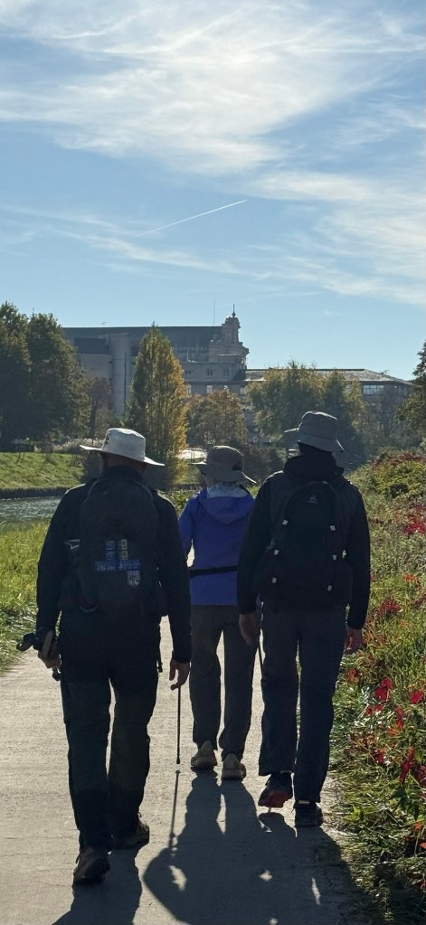 Our last day of hiking! After a chilly start (6C/43F) it was a beautiful day with blue skies, gentle breezes and easy walking. Because we had to return the cars yesterday our initial plan was to get an Uber to our starting point in Conde sur Marne… but there were no Ubers available. Plan B: hike to the Via, avoiding most of the main roads by following the tracks. This would bring us out about 6km into the route… but there was a big hunting party on the tracks and they advised us to stay on the roads. Plan C: we hiked the 2.5km of roads to join the Via near Juvigny, then continue the Via along the Canal Latéral à la Marne into Châlons en Champagne for a total hike of about 12.5km/7.8m.