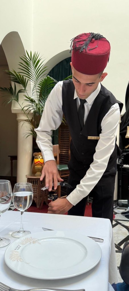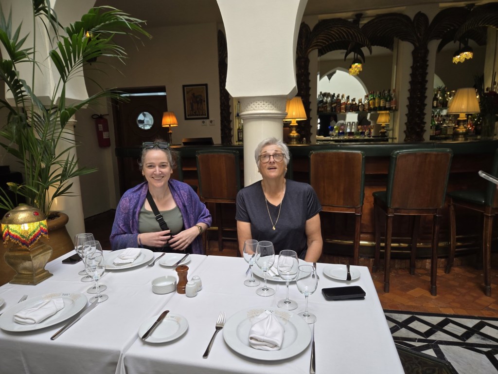 The rest of the group has arrived… Lynn’s other friend, Beth (from Maine via Spain) flew in late this afternoon and Sarah (also from the US) arrived just in time for dinner. Our “food adventure” kicked off at 6pm in our hotel with a briefing from our guide Youssef, then it was down to Les Fleurs for a group dinner.