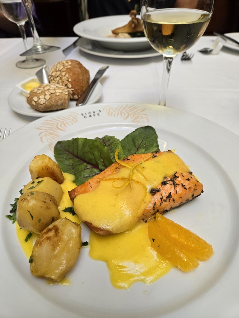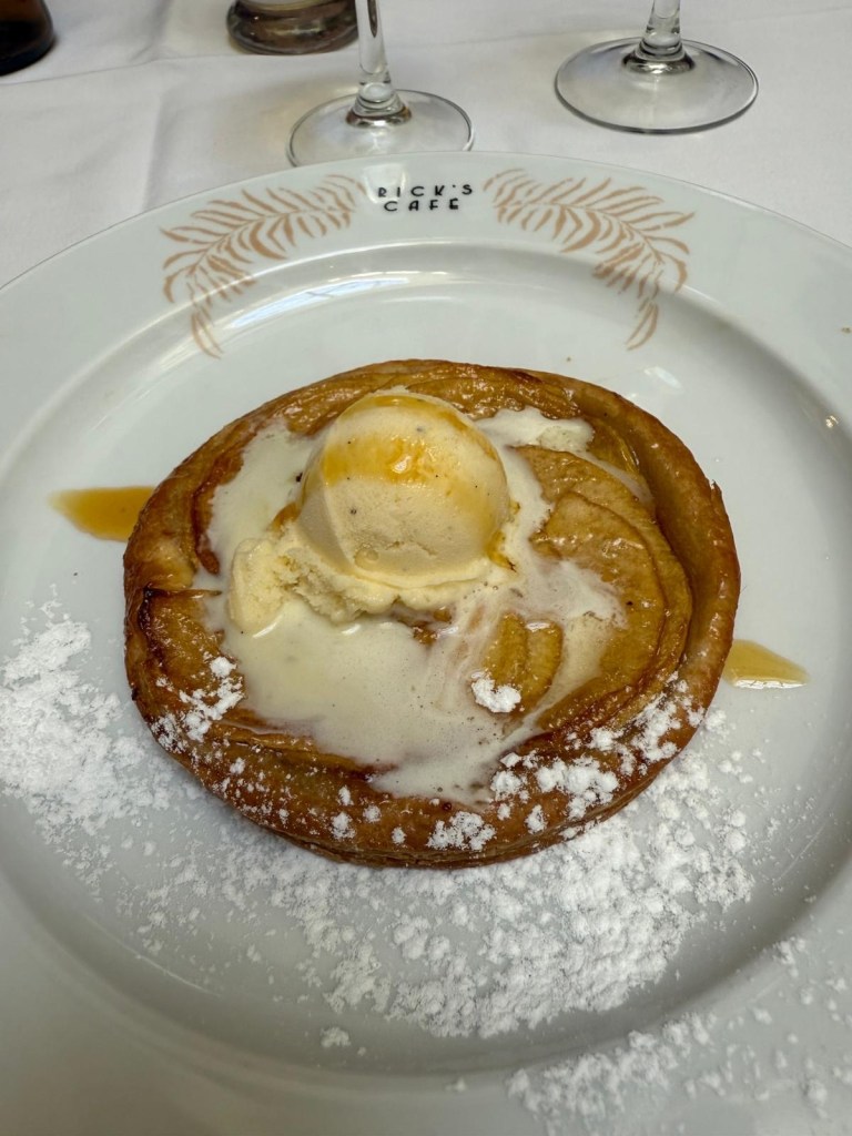 We enjoyed some great wine (French Chablis) and the nostalgic atmosphere. The food, however, was underwhelming to say the least (Beth thought it was so bad it was hilarious… Fawlty Toweresque) and piano/singer was too loud. “As time goes by” featured prominently as you would expect!