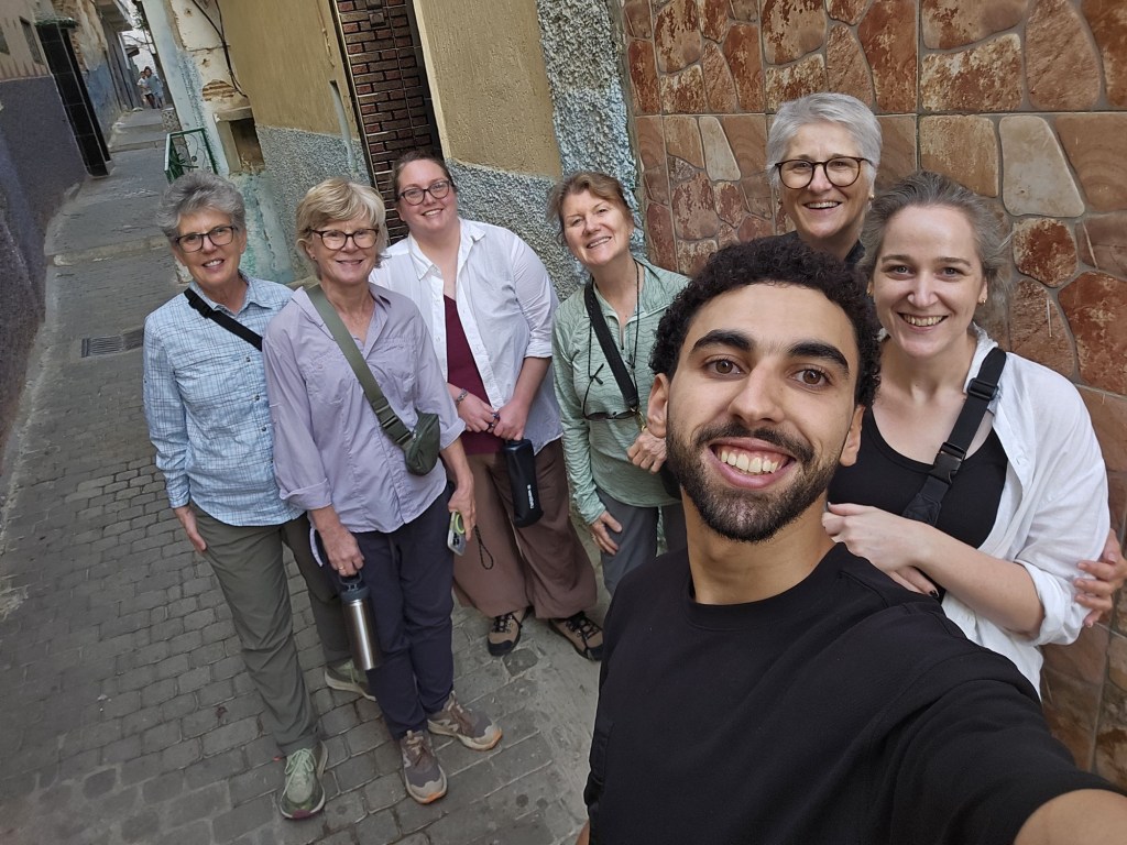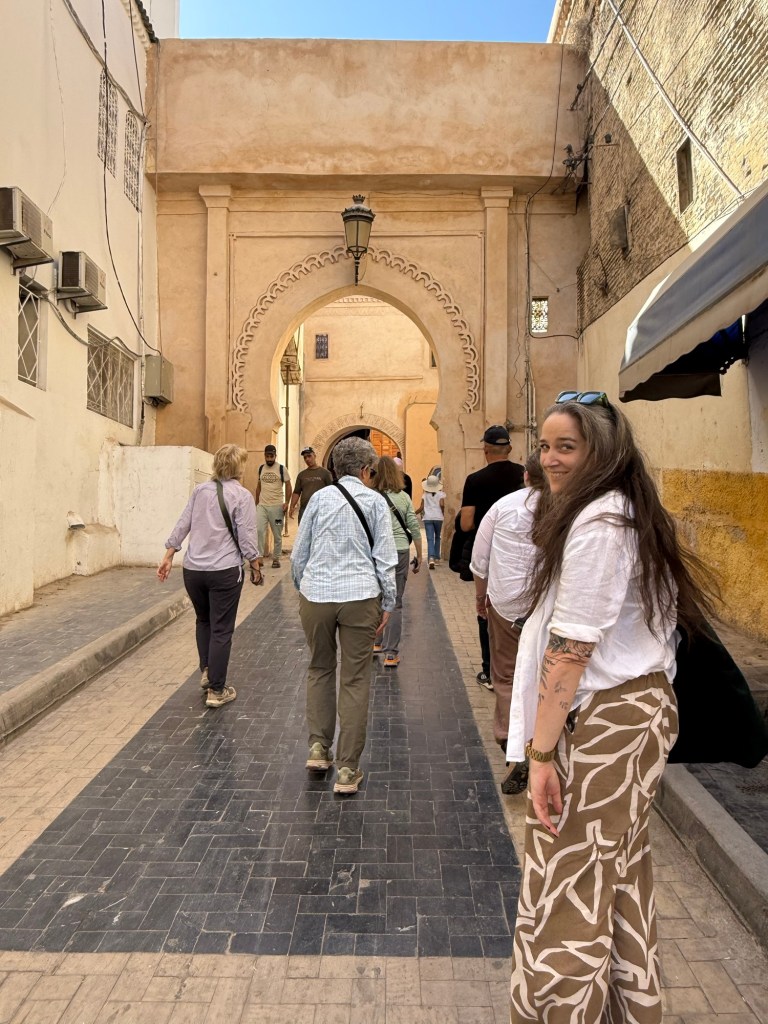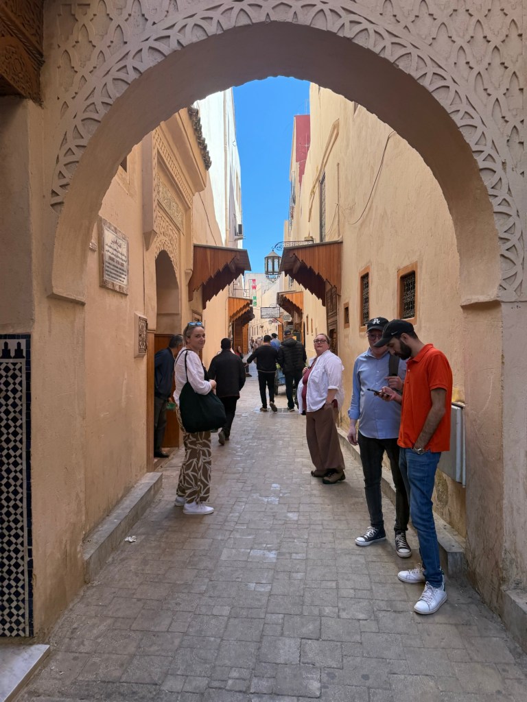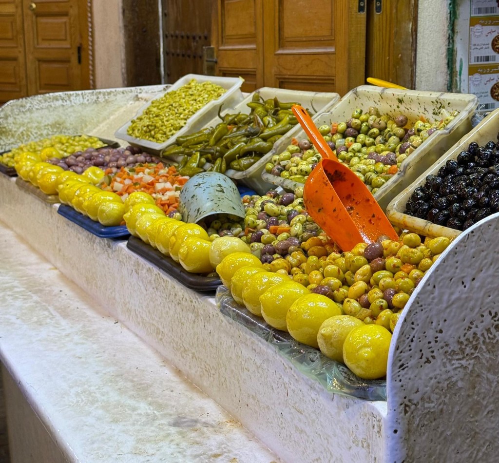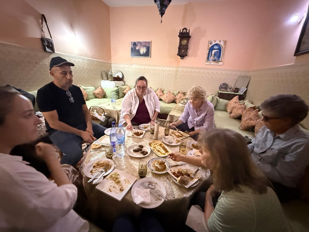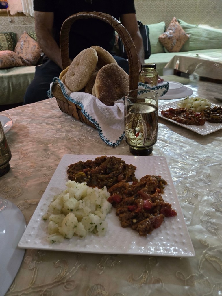 Meknes is known for its imperial past, with Sultan Moulay Ismail making the city his capital in the 17th century. Here Youssef led us through the old medina to a private house where our host Hassan provided us with a delicious lunch of salad/ dips with bread including zaalouk (eggplant and tomatoes), potato with cilantro/coriander and taktouka (green peppers and tomato), a fabulous lentil and sauce dish. We (some of us) also had camel burgers that were very tasty… subtly spiced, the flavour was stronger than beef and less gamey than venison. Beth (Butt) described it as like “sweet beef”.