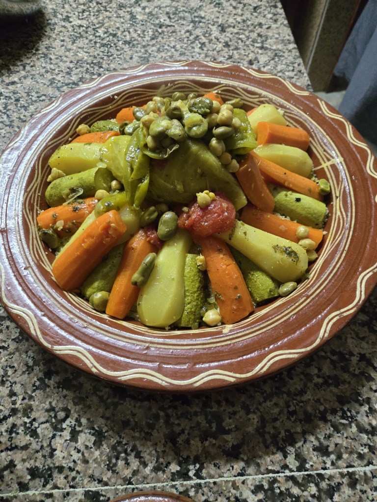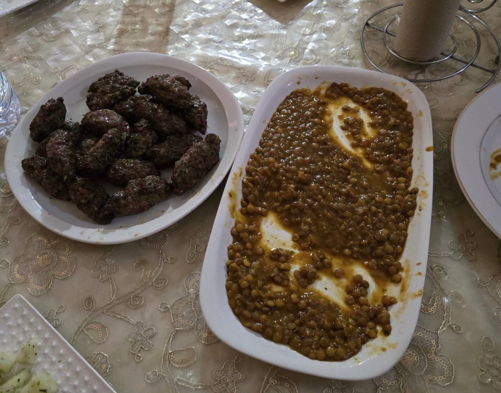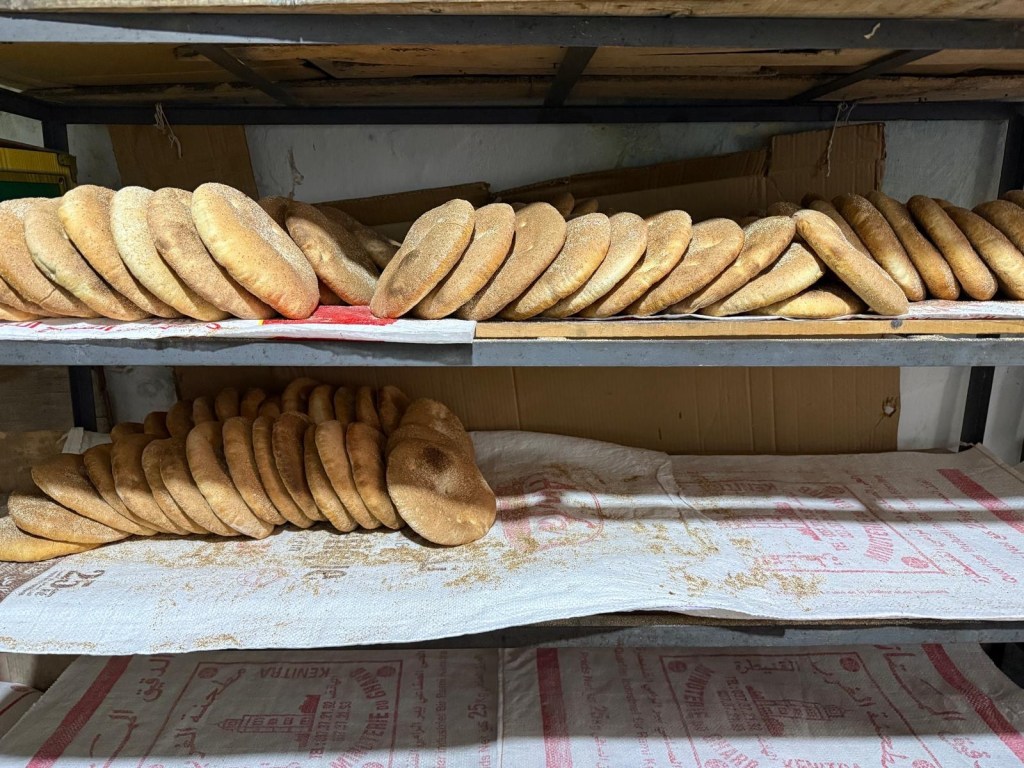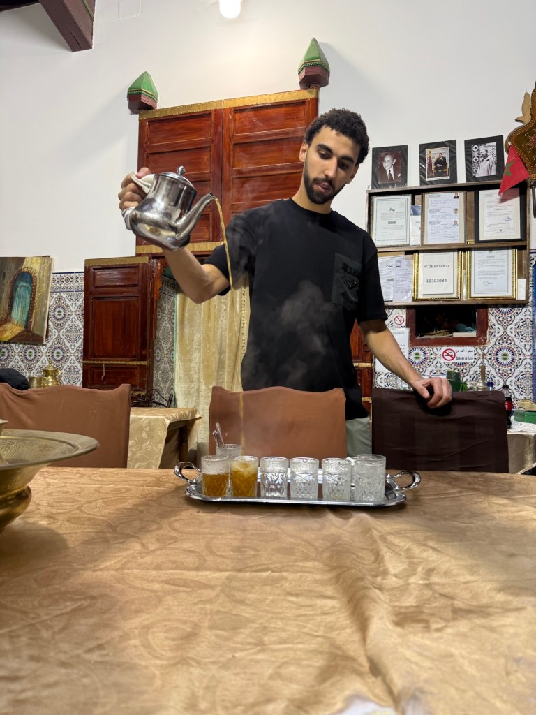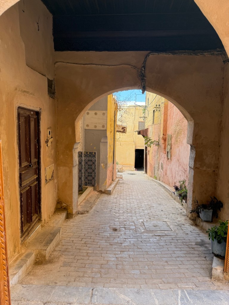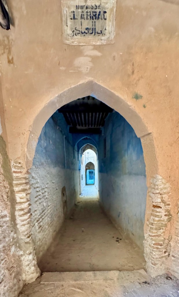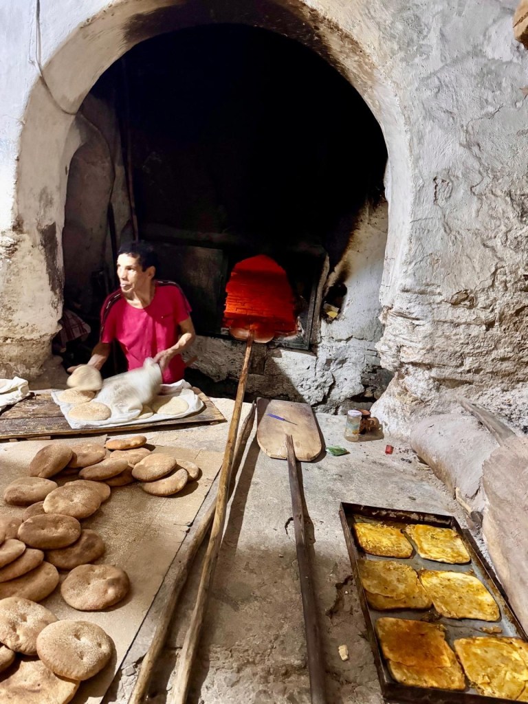 Meknes is known for its imperial past, with Sultan Moulay Ismail making the city his capital in the 17th century. Here Youssef led us through the old medina to a private house where our host Hassan provided us with a delicious lunch of salad/ dips with bread including zaalouk (eggplant and tomatoes), potato with cilantro/coriander and taktouka (green peppers and tomato), a fabulous lentil and sauce dish. We (some of us) also had camel burgers that were very tasty… subtly spiced, the flavour was stronger than beef and less gamey than venison. Beth (Butt) described it as like “sweet beef”.