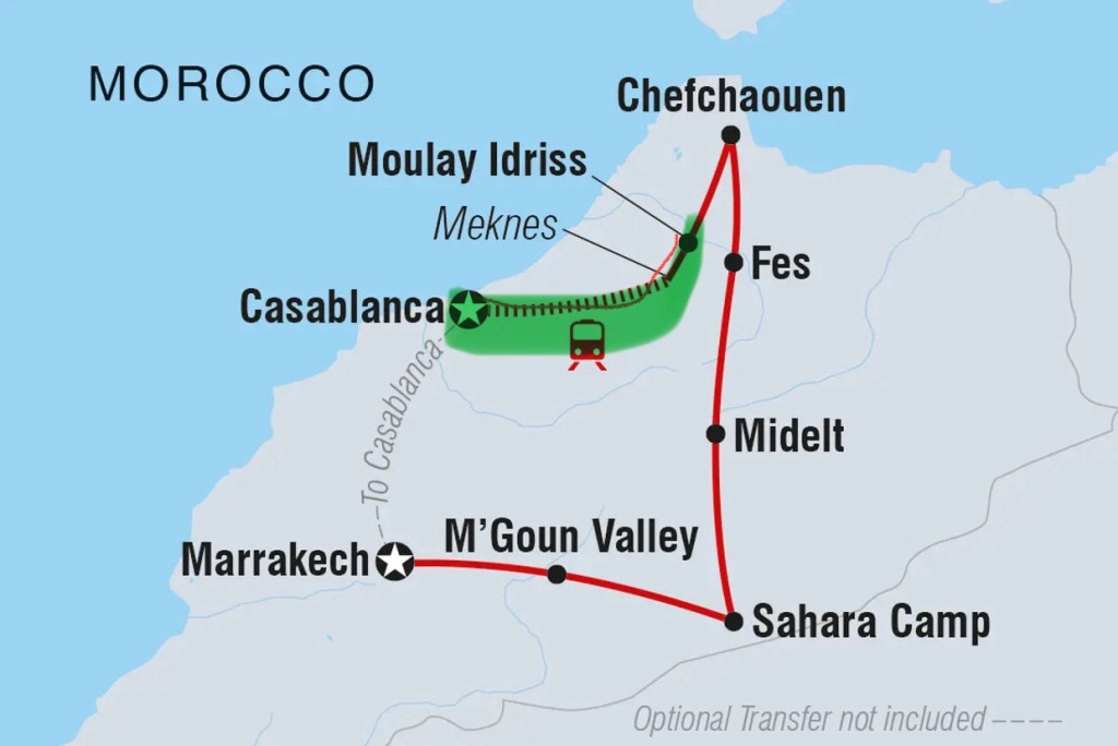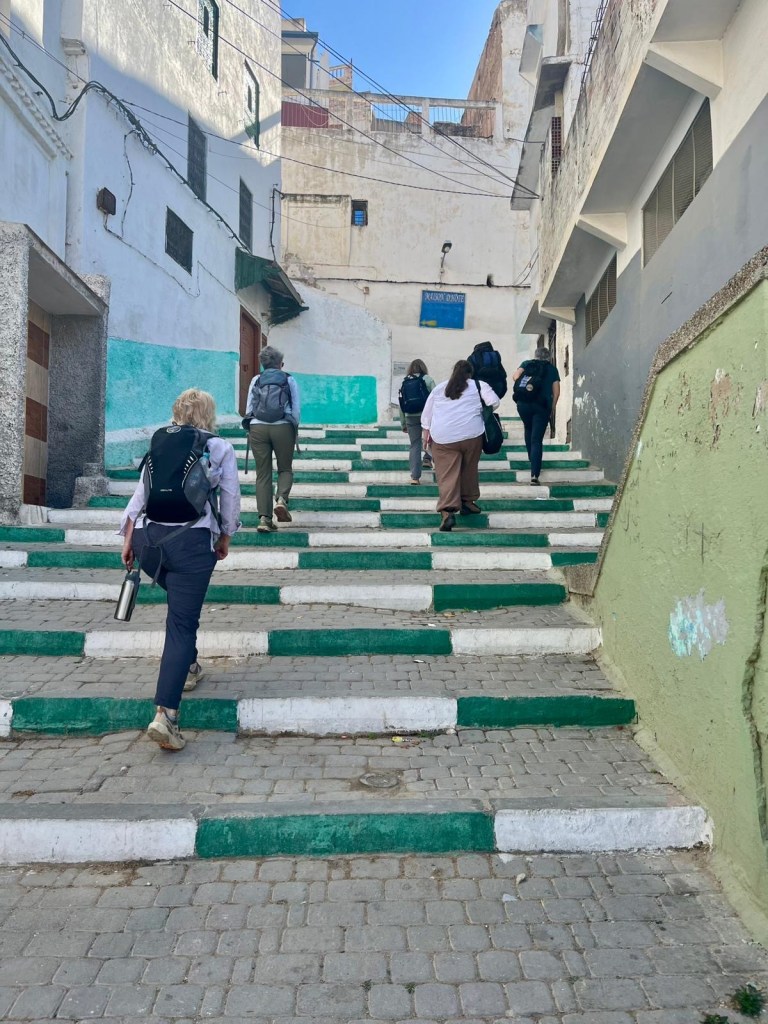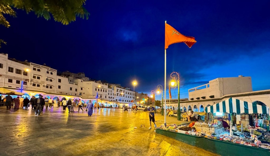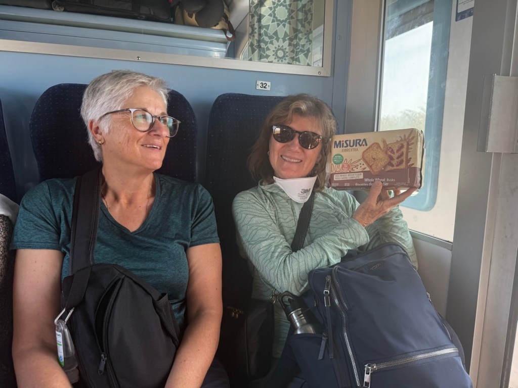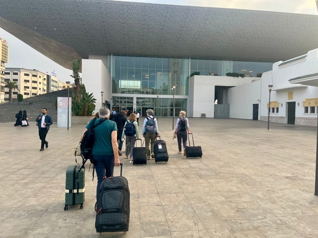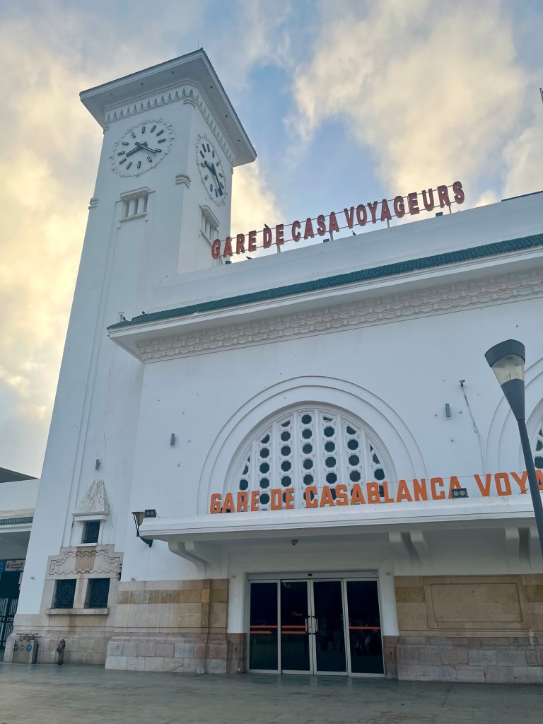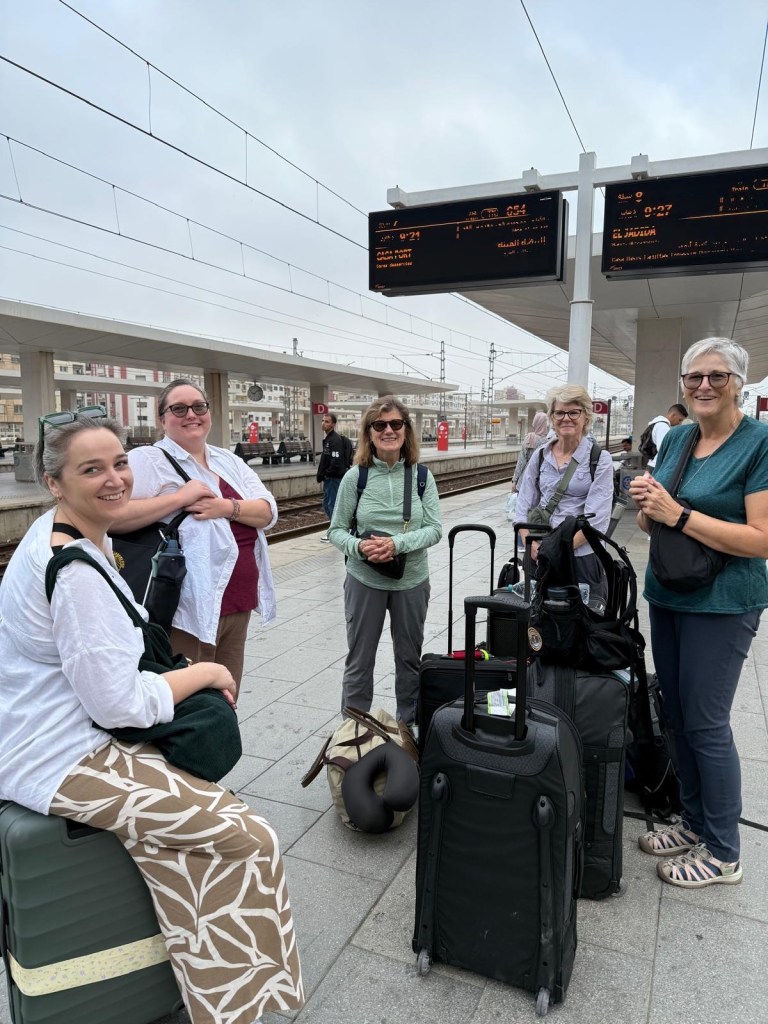 The train trip took (3.5 hrs) and went via Rabat, Morocco’s capital. It was very full (it’s school holidays here) and the seats a bit squishy but all in all not too bad, at least in our compartment.