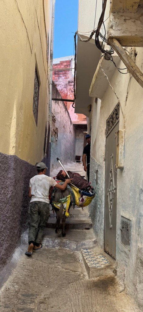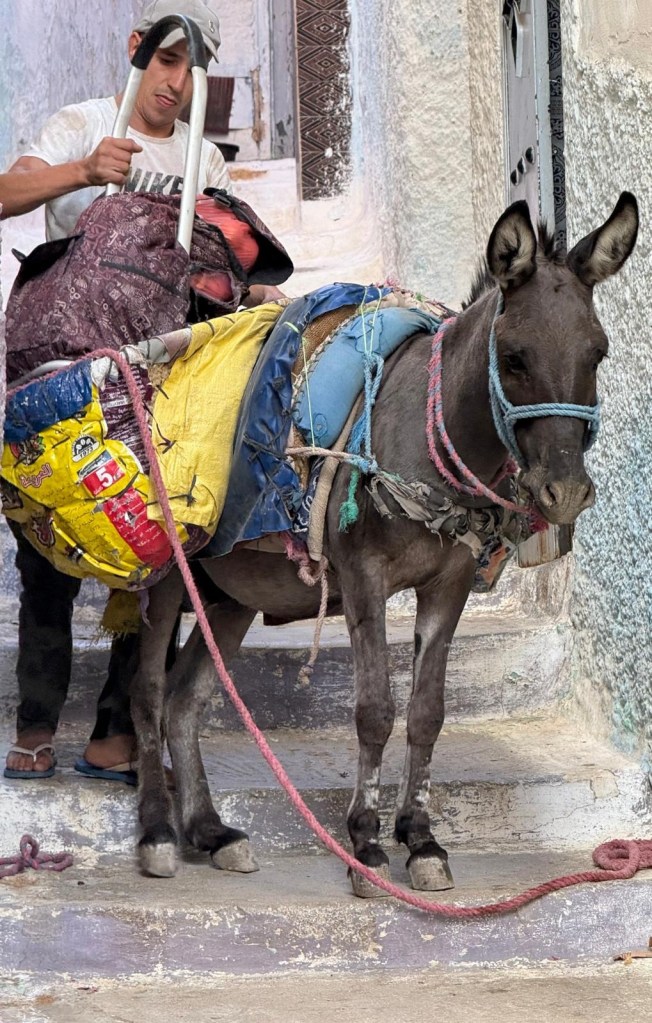Moulay Idress is a hill top town, with lots of stairs and steep inclines. There are no cars once off the main street and deliveries are done by donkey, including our luggage.